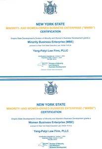 YANG-PATYI LAW FIRM is a NEW YORK STATE CERTIFIED MINORITY BUSINESS ENTERPRISE (MBE) AND WOMEN BUSINESS ENTERPRISE (WBE)